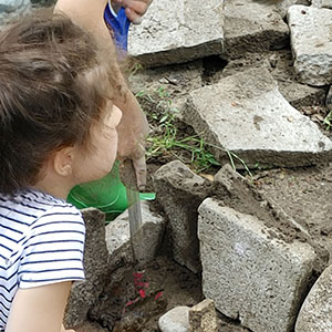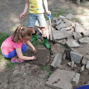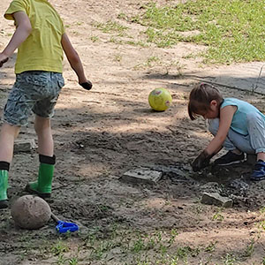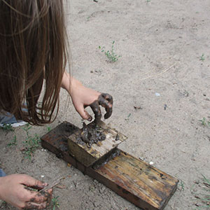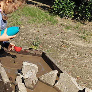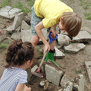 Szpadle, łopaty, grabie. Ważne jest by dopasować np. długość trzonka narzędzi do wielkości dzieci. W przypadku adaptacji narzędzi kupionych w sklepie trzonek szpadla czy grabi powinien być skrócony o ok. połowę.